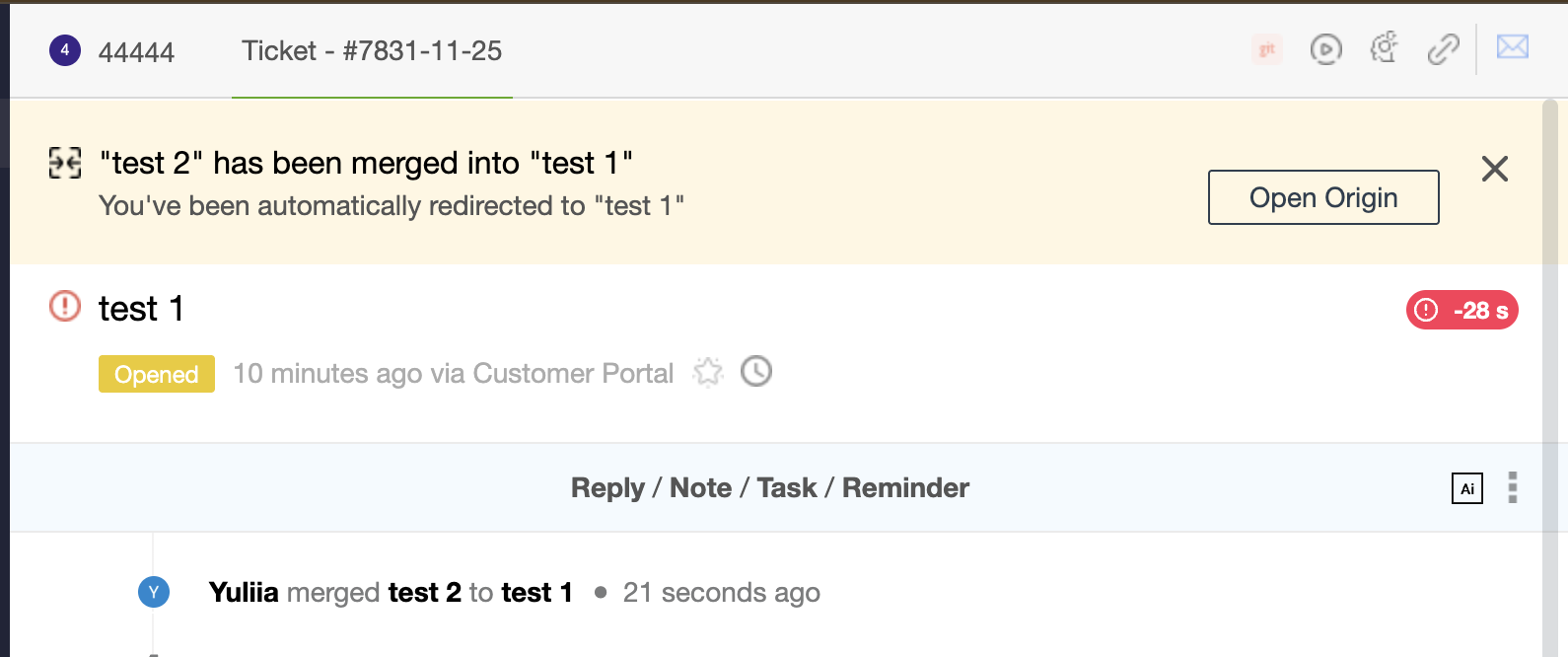 - Agents can still open a merged ticket via a notification link, the Open Origin button, or the Activity Log. The merged ticket opens in read-only mode.