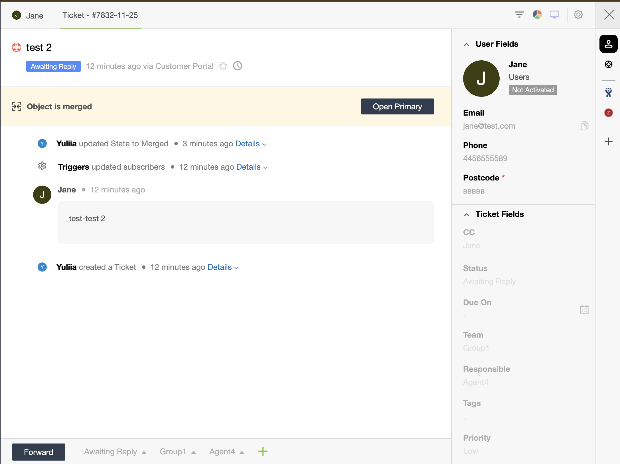 - After merging, the agent is automatically redirected to the primary ticket/topic, a banner is displayed, and all comments from the merged ticket are move to the primary one.
