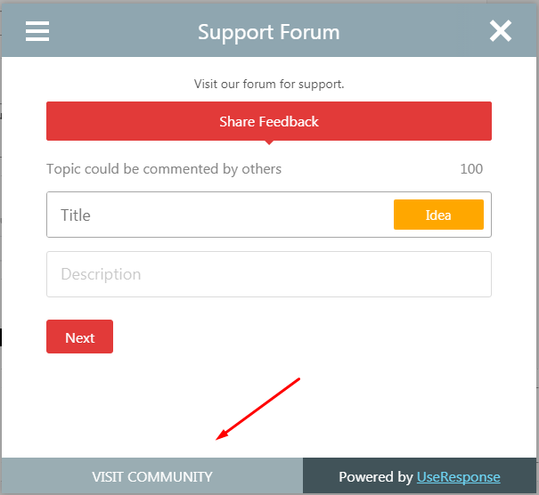 In case user wants to see the list of all existing ideas in your community, there is "Visit Community" button in the widget by clicking on which user will be redirected to your help center.