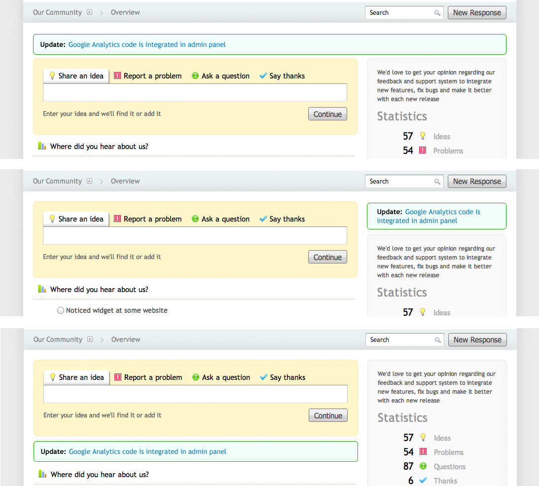 One feature, that we like, which getsatisfaction has is "Company Updates" Company Updates are for the most part just another response type, like (question,idea, etc). However there are a few important features that make company updates great.