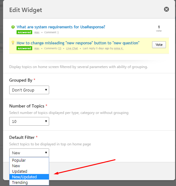 Please go to Administration - Interface - Home Screen and click edit icon in Topics Filter widget where you can select the required filter (as shown in the attached screenshot).