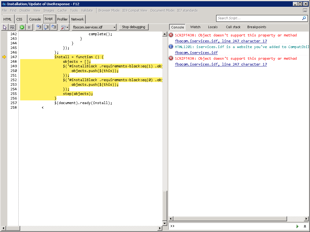 Try to install UseResponse using Firefox browser (with FireBug extension) or Google Chrome. IE doesn't provide extended information in debug console. You need to catch XmlHttpRequests (Ajax) calls and see what response returns.