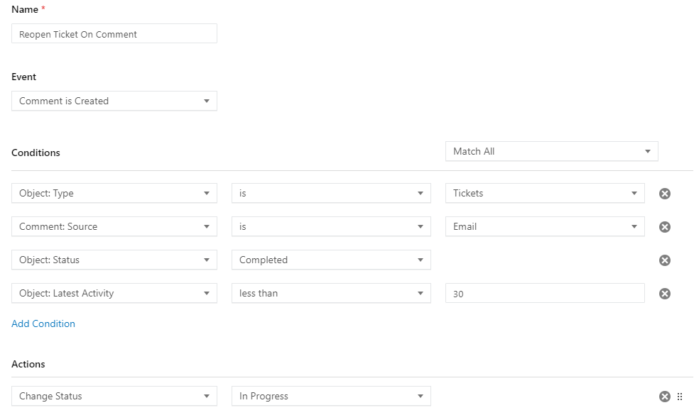 We added new condition "Object: Latest Activity" for "Comment is Created" event. Now your trigger "Reopen Ticket On Comment" could be built as shown in the screenshot attached.